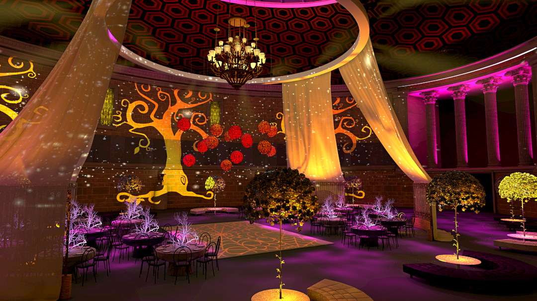 Dead rosebushes lit with amber lights are the centerpiece for the lounge seating around the perimeter. A dance floor with a spider web gobo lights up the inner circle. Projected star constellations, layered over Tim Burtonesque trees, glitter in the darkness.